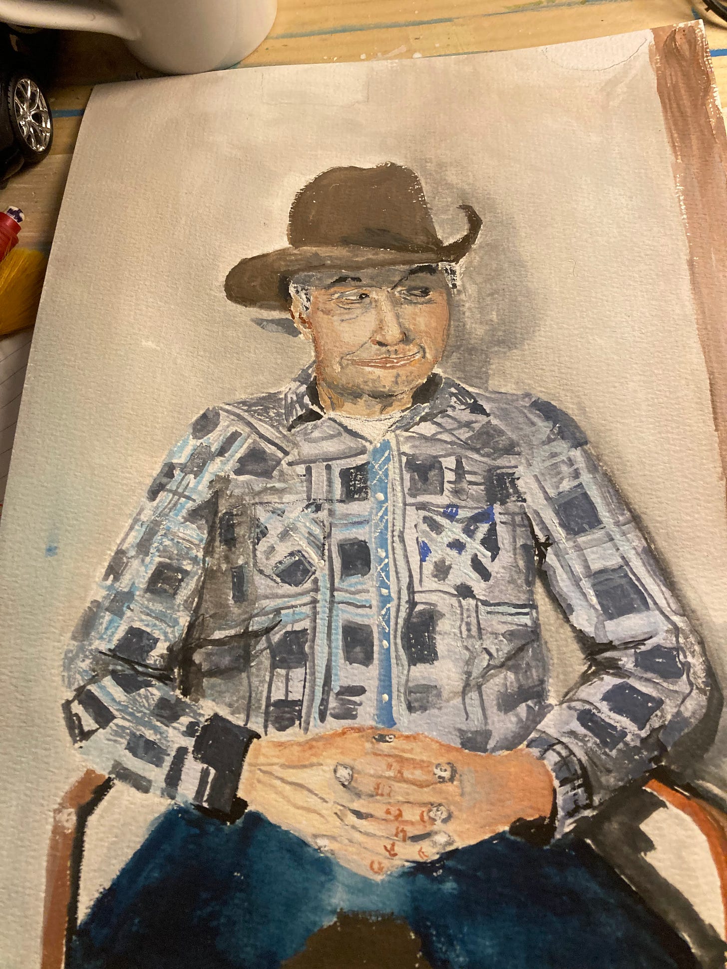 Cowboy at bar in British Columbia, from photo in National Geographic, July 1986